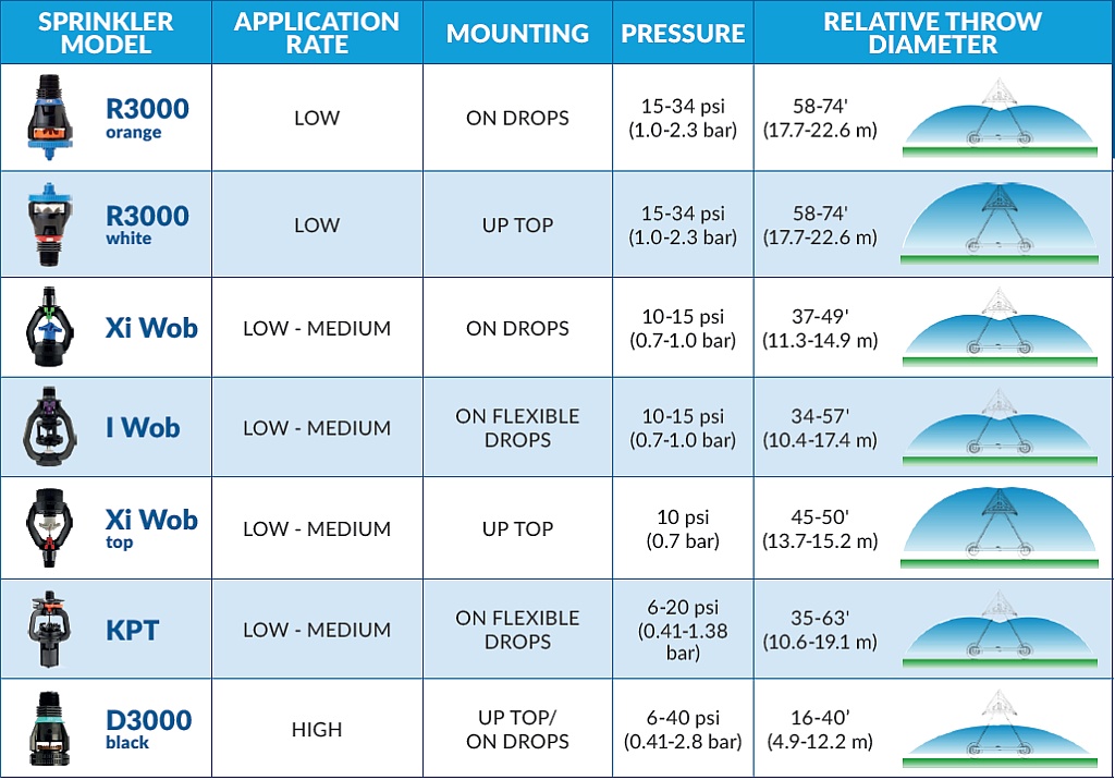 Az öntözött kultúra igényének megfelelően 7 féle öntözőfejből lehet választani